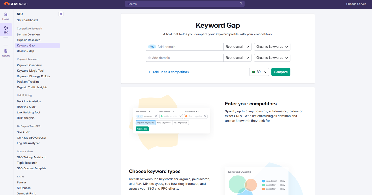 Com os insights da concorrência em mãos, é hora de refinar ainda mais a seleção. Uma das ferramentas que mais uso para isso é o Keyword Gap Lacuna de palavras-chave). Com ela, compare os termos usados por até cinco domínios semelhantes ao meu e identifique oportunidades únicas.