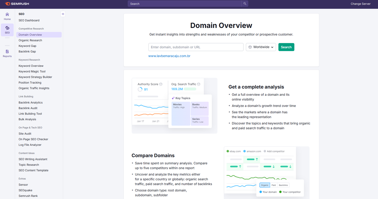 No Semrush, começo pela ferramenta Domain Overview (Visão Geral do Domínio). Basta digitar o endereço de um site do setor e, em segundos, vejo quais palavras trazem tráfego, como está o posicionamento orgânico geral e até sugestões de termos em alta.